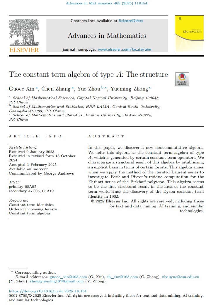 近日,bevitor伟德青年教师钟岳明副研究员,与首都师范大学辛国策教授、中南大学周岳教授及首都师范大学张晨博士合作,在国际著名数学期刊《Advances in Mathematics》上发表了题为《The constant term algebra of type A: The structure》的学术论文。