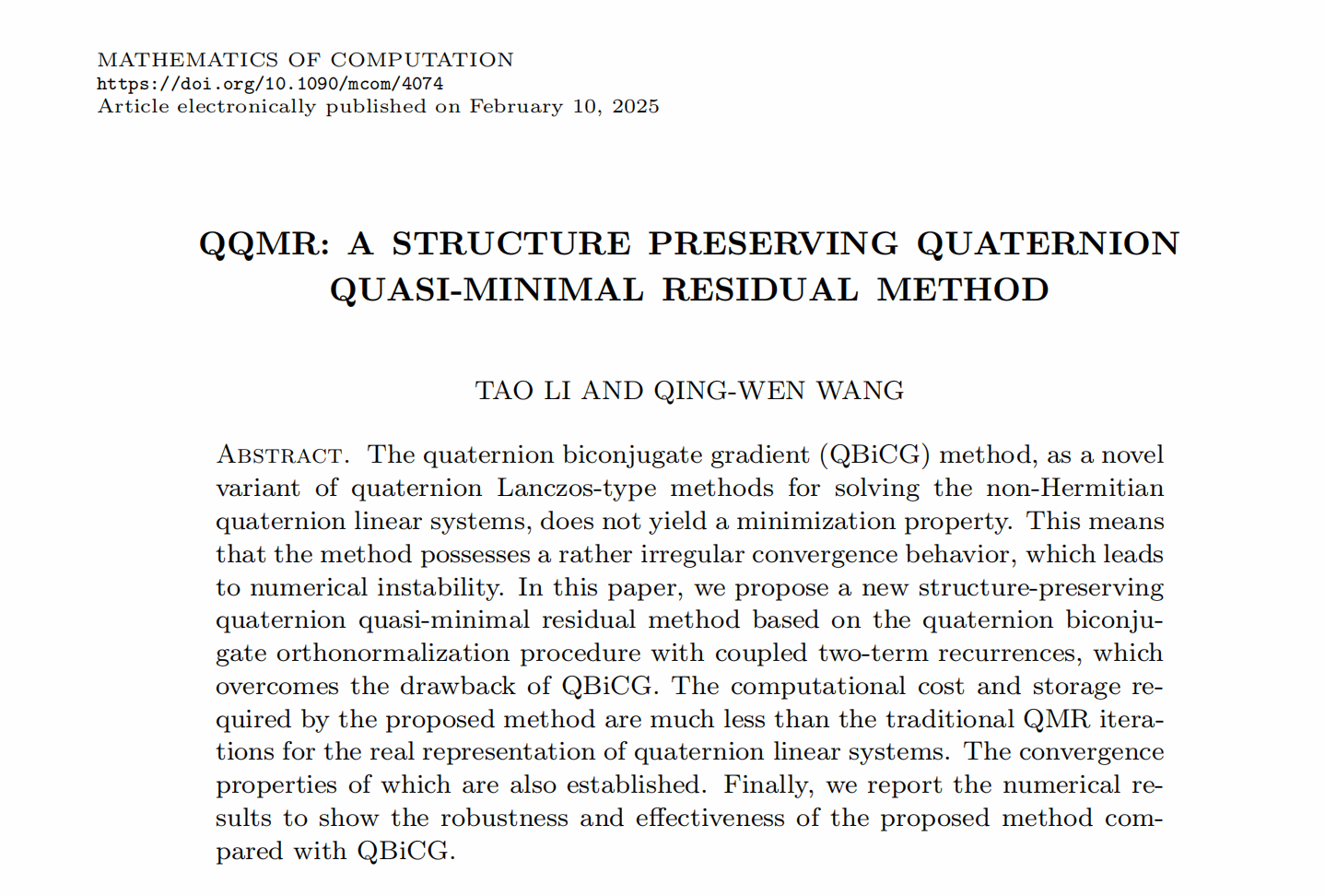 近日,美国数学学会期刊《Mathematics of Computation》在线发表了BEVITOR伟德李涛博士(第一作者)和王卿文教授的最新研究成果“QQMR: A structure preserving quaternion quasi-minimal residual method”。《Mathematics of Computation》是国际上计算数学领域的顶级期刊,由美国数学学会出版,创刊于1943年,专注于数值分析、计算方法和数学应用等领域的高质量研究。该期刊在学术界享有很高的声誉,发表的文章通常具有重要的理论或应用价值。在中国数学会推荐的数学期刊分类简表中被列为T1类刊物,在中科院分区中也是1区Top期刊。BEVITOR伟德为此成果的第一完成单位,通讯作者为上海大学王卿文教授。