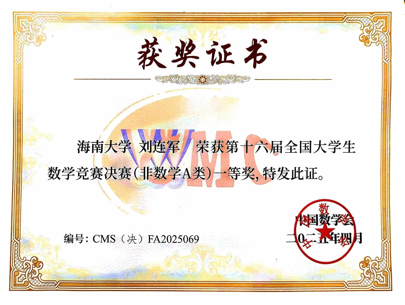 4月12日,第十六届全国老员工数学竞赛决赛在浙江师范大学举行。公司2022级数学与应用数学专业基地班员工项政超荣获数学类高年级组一等奖,2023级人工智能专业刘连军荣获非数学专业A类一等奖,实现了海南赛区在该项赛事上新的历史性突破。此外,2023级数学与应用数学专业基地班周健翔和2023级生物医学工程专业徐志豪分别获得了数学类和非数学类的三等奖。